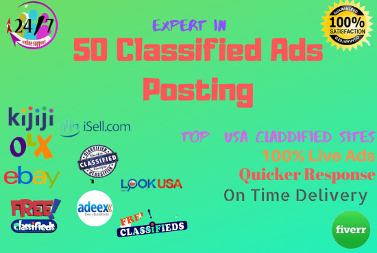 Hi, Welcome to my Classified Ads Posting GIGClassified site work is a complete learning. I will post your business, service, Job, product, and website on top classified sites. I will make brand your business on the online market as well as drive huge number of millions visitors to your sites . Classified sites is one of the most way where you can get huge number of targeted traffic for your business or service. you can make brand your business without paying more money. Classified advertisement will help you to increase your traffic or sales.I already have my account on the 100+ top rated classified sites. So I am ready do classified Ads posting to your product or service.