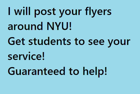 Do you want to promote you business to NYU students and other schools (The New School, FIT, BMCC)? I can help! I am a student at NYU with access to most buildings and I know where all the best spots to post your ad are. I will post and distribute to your desire!Reviews