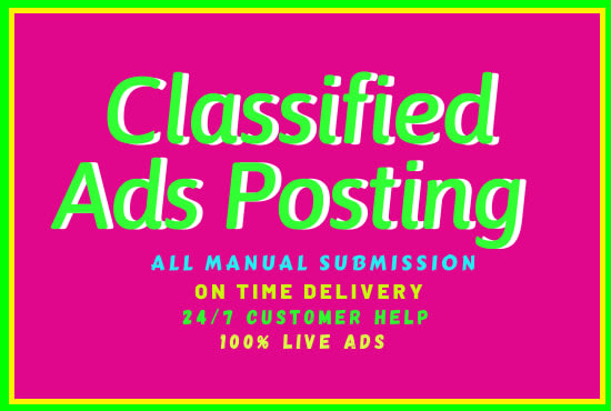 >>>>>>>>>>>>>>>>>>>>>>>> Welcome to my Gig >>>>>>>>>>>>>>>>>>>>>>>>>>>>I will post your Website ads perfectly in top rated High authority USA, CANADA, UK & others Country's classified sites, and on my Groups then millions of people see my post, this is another great way to get more visitor to your site. I have gained a lot of experience in this regard. I know the working of classified posts very well. I have many active Accounts on USA classified sites. If you want to quality work, Contact now.